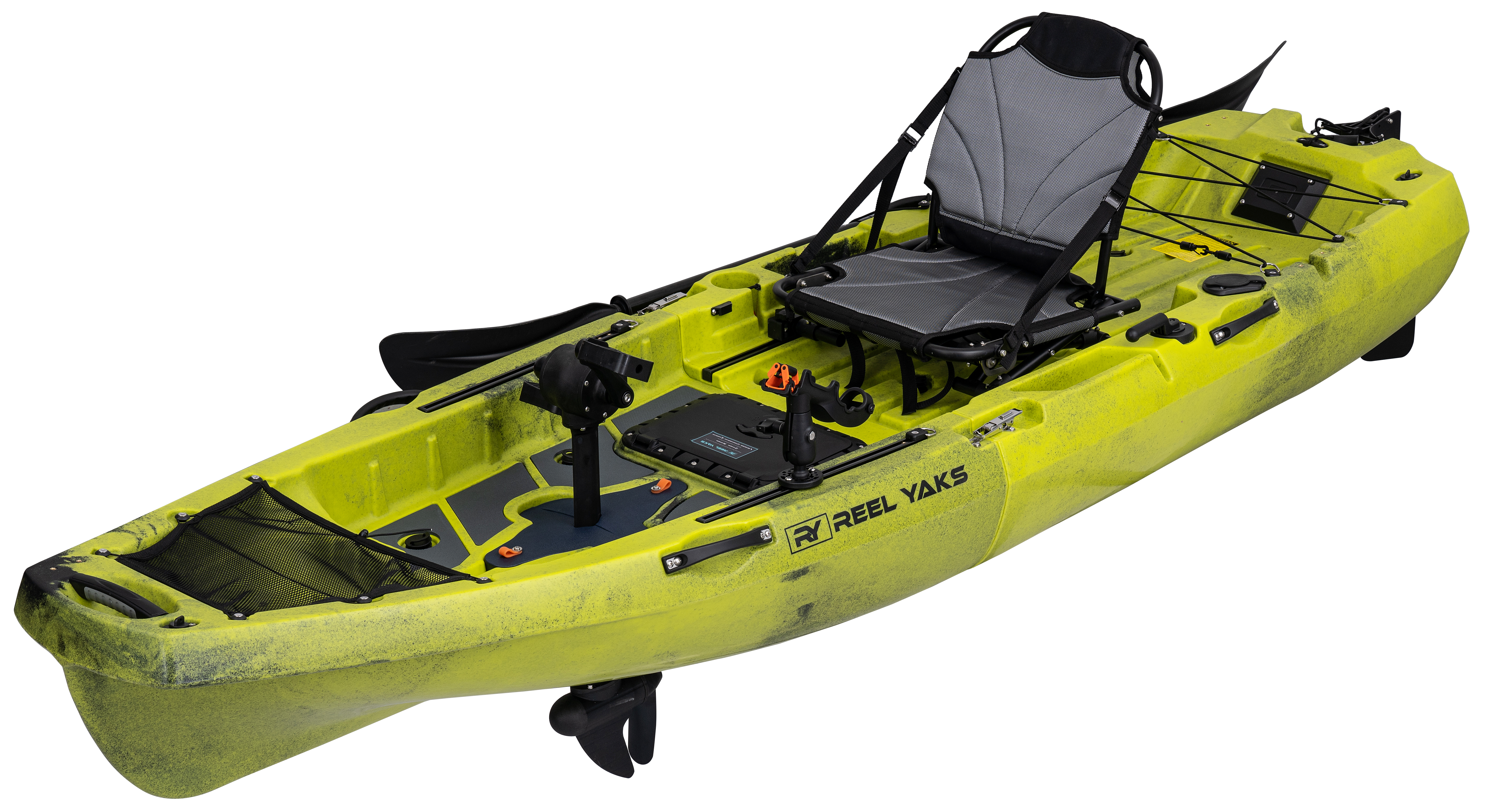 Navigating through ever-changing paddling conditions is a breeze, thanks to the deep-blade rudder system that offers extra assistance when needed. Built to withstand the test of time, this kayak guarantees unparalleled stability, even when standing, making it an indispensable asset for every fishing enthusiast. Set sail on your next fishing expedition with unmatched confidence and style aboard the Reel Yaks 10ft Radar Propeller Drive Kayak.