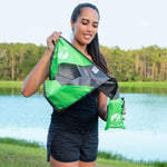 Our pocket blanket packs down small, yet it expands to 60" x 56" when unpacked, allowing 2 adults or 4 children to sit comfortably with 100% Waterproof Ground Protection! Whether you are backpacking through the ALPS or traveling to the beach, simply slide it into your pocket or attach it to your pack with its CARABINER** Super Easy to fold and place back in its pouch.