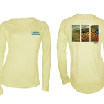 Lightweight sun protective SPF 50 fishing shirts with a raglan sleeve women's cut. We place Ed Anderson's "Colored Brown" on the back of this pale yellow-colored long sleeve T. The Fincognito logo adorns the left chest. 100% polyester with PURE-Tech wicking technology. Our fly fishing apparel works well on the water or as hiking clothes on the trail. Great sun protection, moisture wicking apparel.