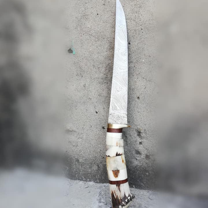 Damascus Steel Handmade Fillet Boning Knife with Stag Horn, Bone and Brass Finger Guard Handle, 12-Inch Overall Length