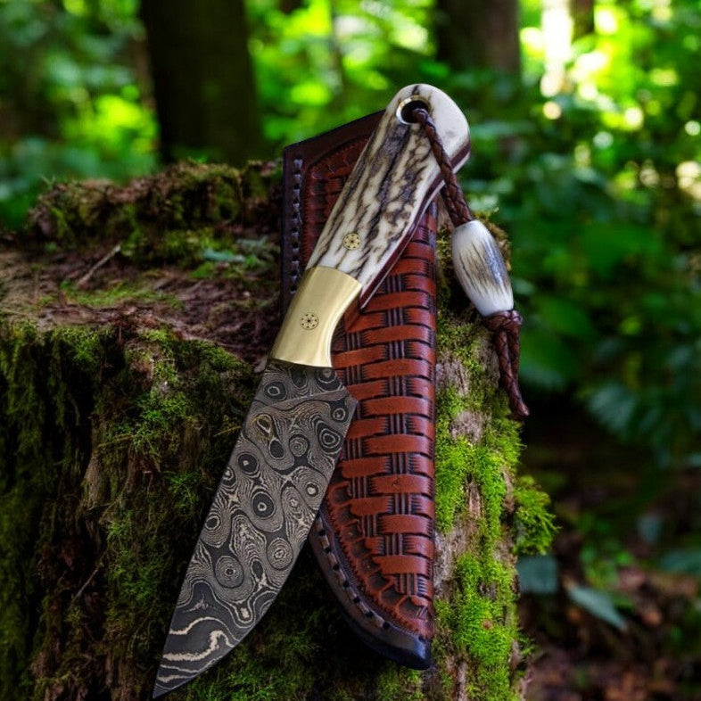 Damascus Steel Knife Hunting Raindrop Blade & Antler Handle