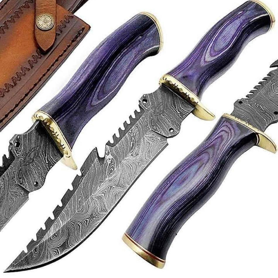 Survival Bowie Knife with Leather Sheath for Sale – Custom Handmade Damascus Steel Blade, Exotic Wood Handle with Brass Guard | 13-Inch Hunting Knife – KBS Knives