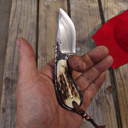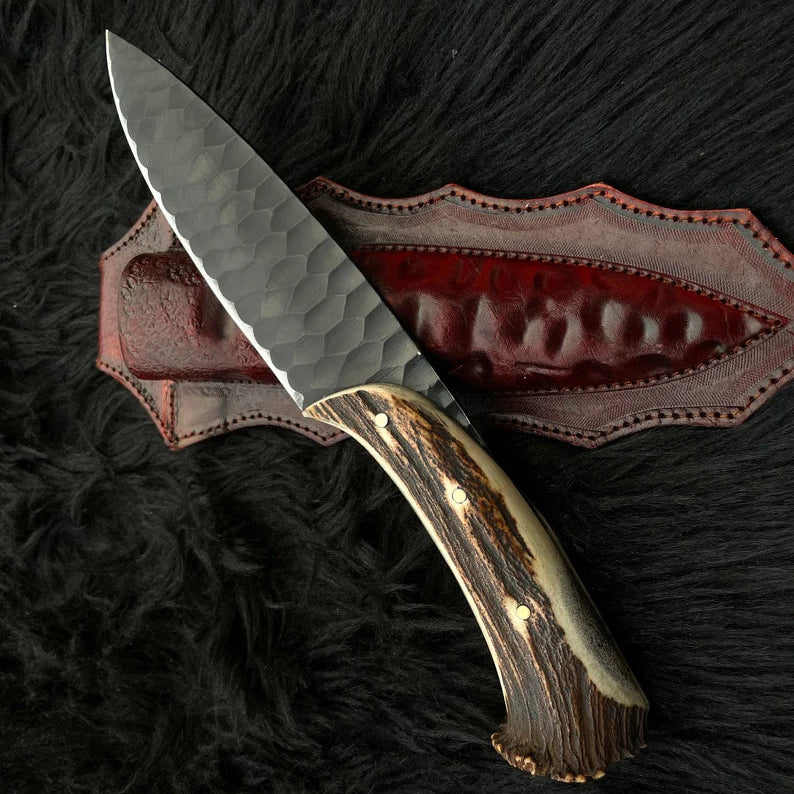 Custom Fixed Blade Cowboy Knife with Sheath - 4.5 Inch Hand Forged D2 Steel Antler Handle