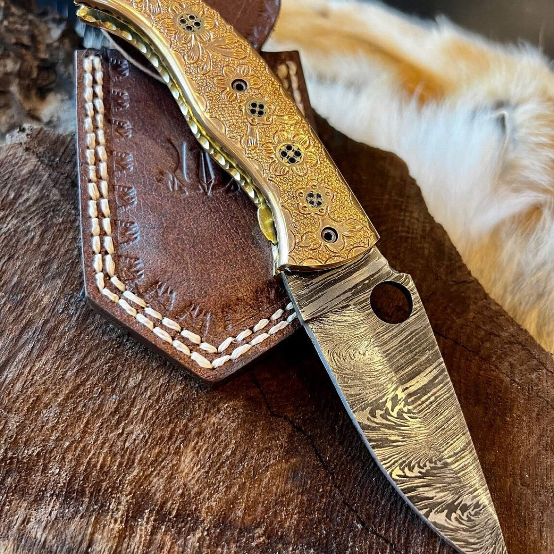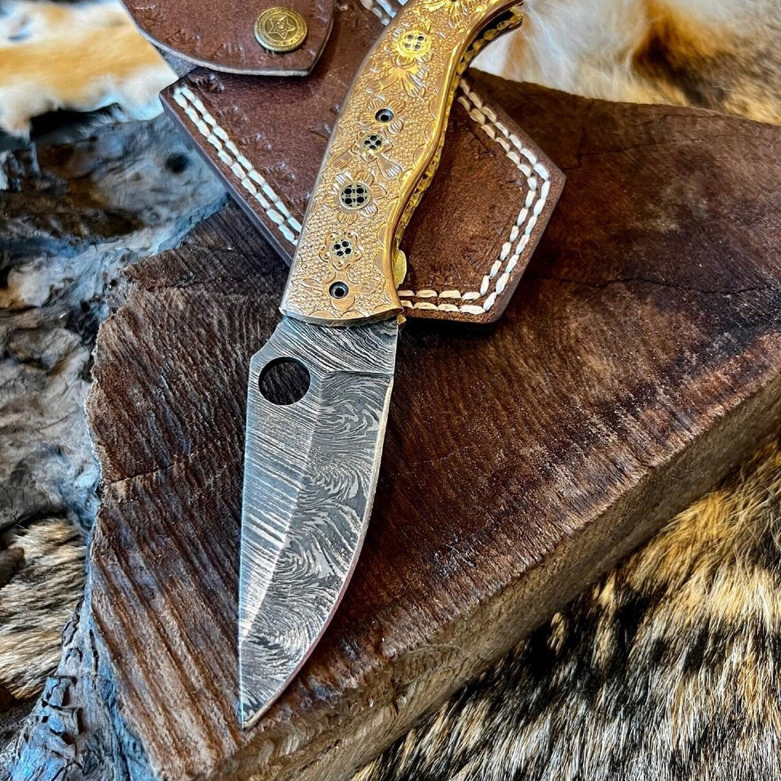 Custom Handmade Damascus Steel Folding Pocket Knife with Hand Engraved Brass Handle
