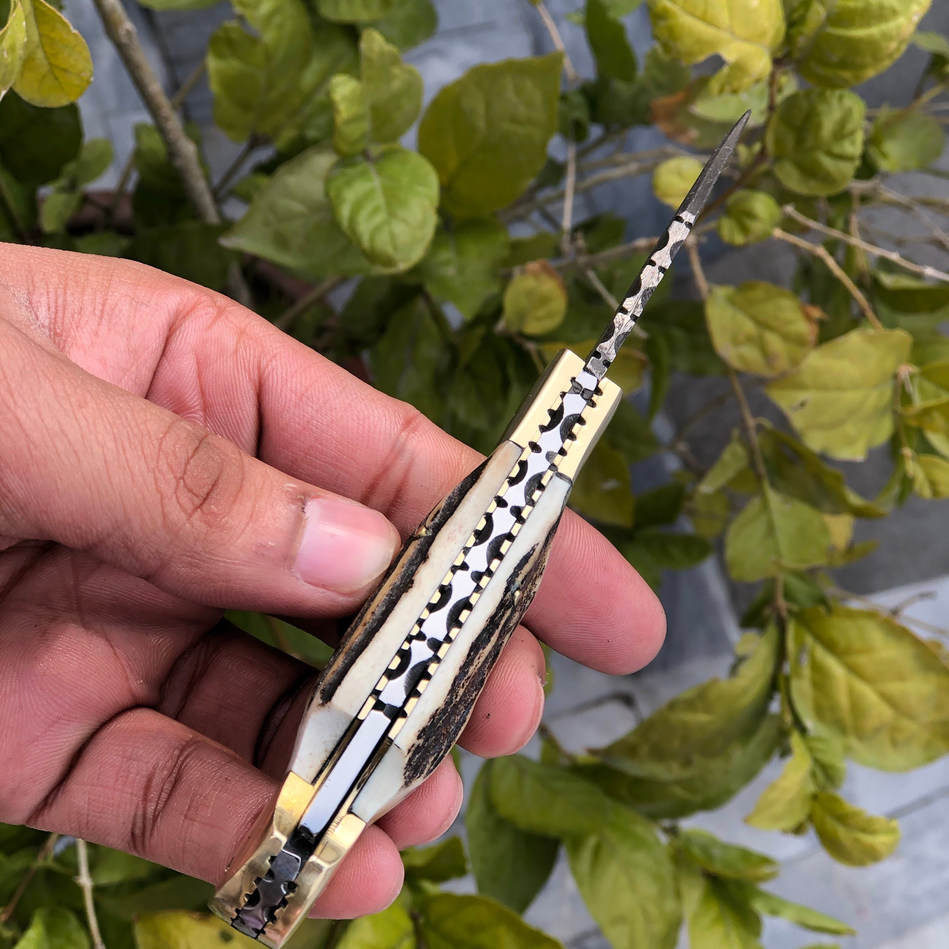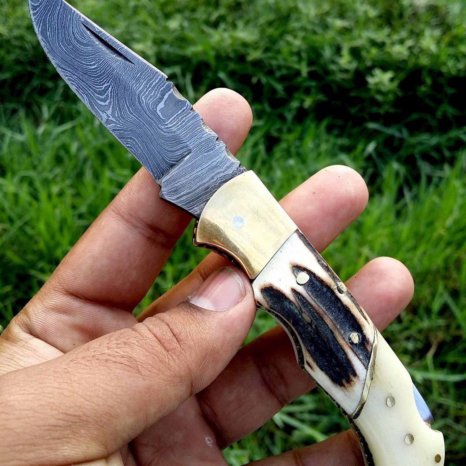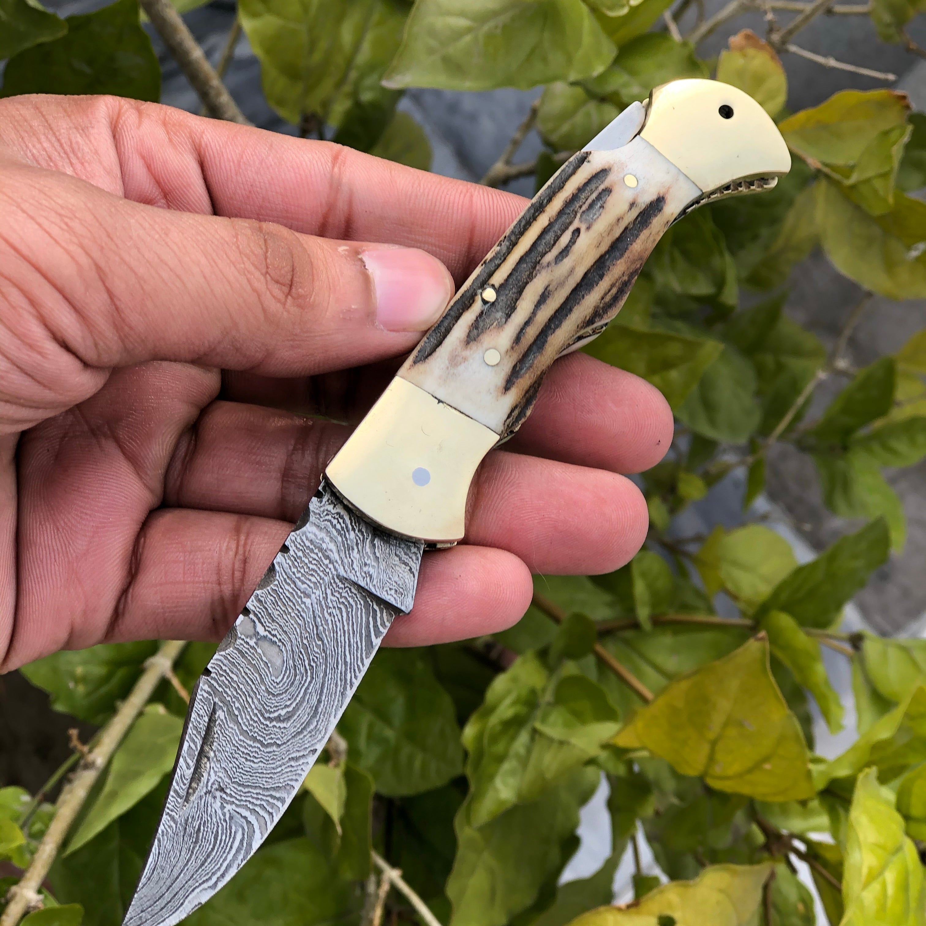 Custom Handmade Damascus Steel Folding Pocket Knife with Antler Horn and Brass Bolsters Handle and Leather Case - For Sale by KBS Knives Store