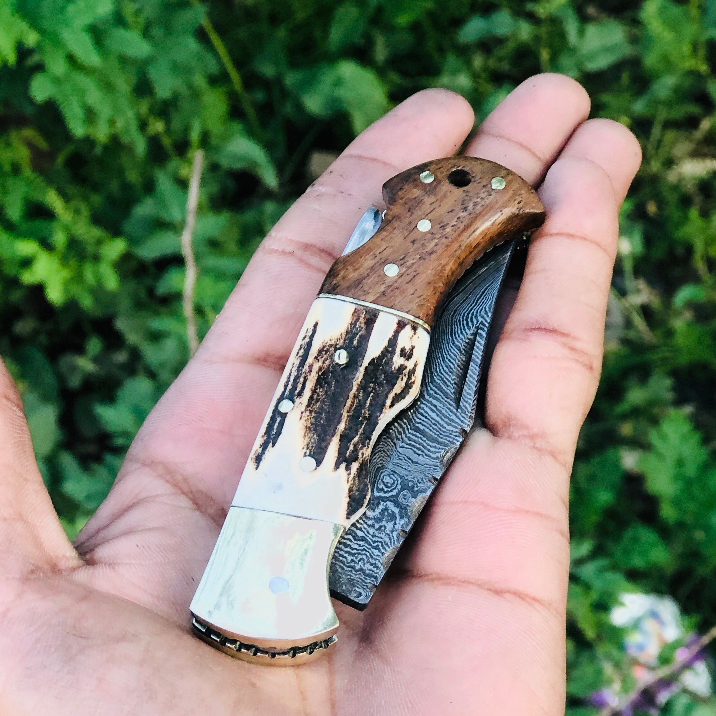 Custom Handmade Damascus Steel Folding Pocket Knife with Bone and Buffalo Horn Handle - 3.34 inch Blade Length by KBS Knives Store