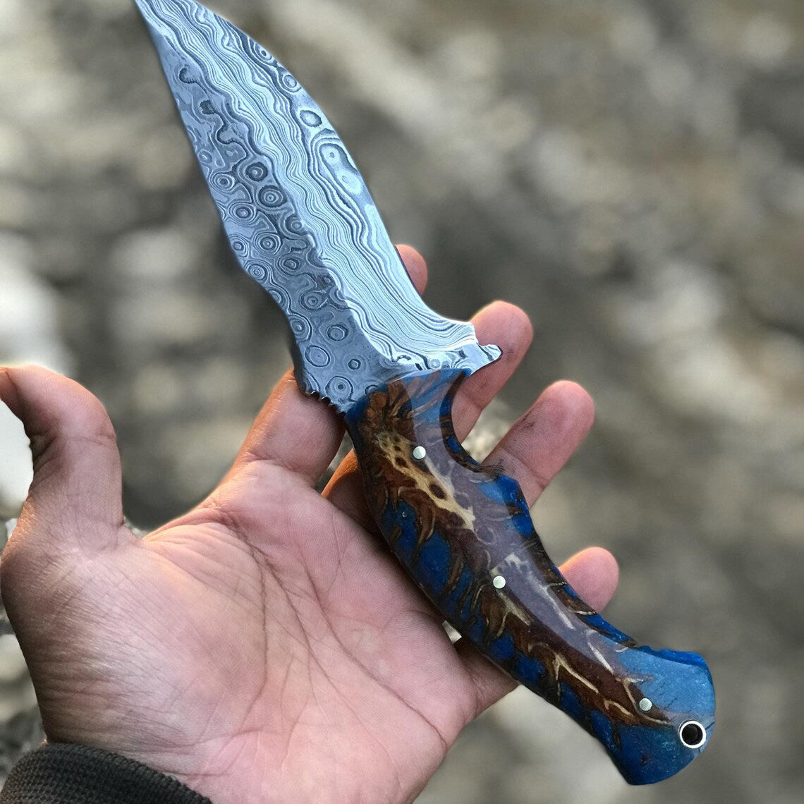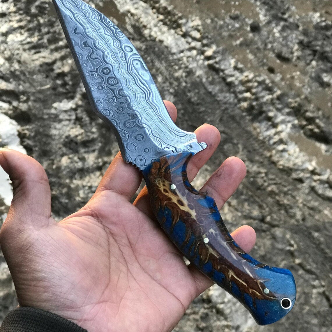 Custom Handmade Damascus Steel Hunting Knife with Epoxy Resin Handle and Leather Sheath - 8.5 Inches by KBS Knives Store