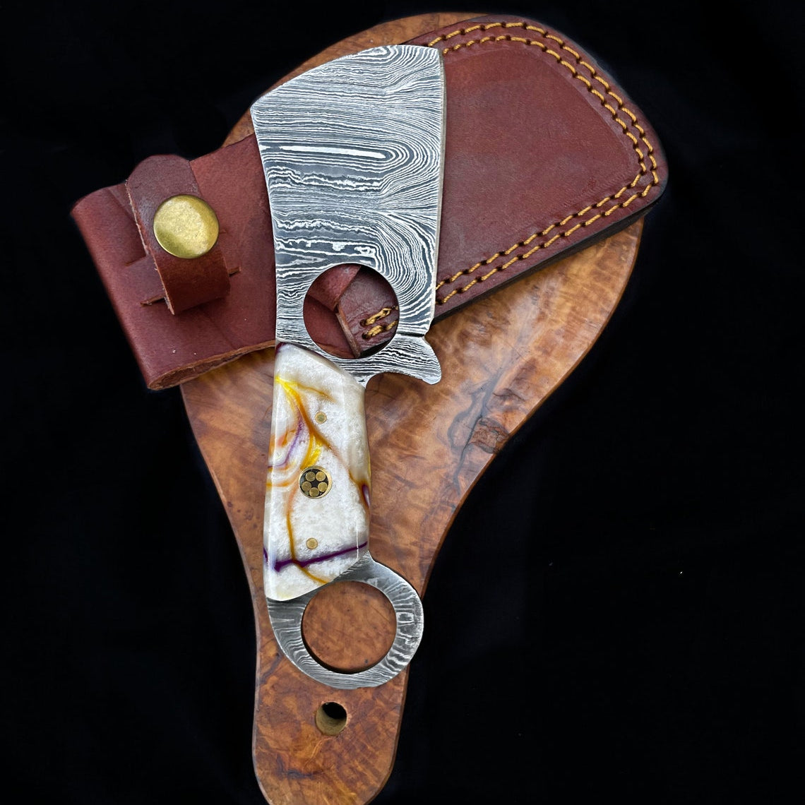 Custom Handmade Damascus Steel Knuckle Knife with Rosewood Handle – 15" with Leather Sheath