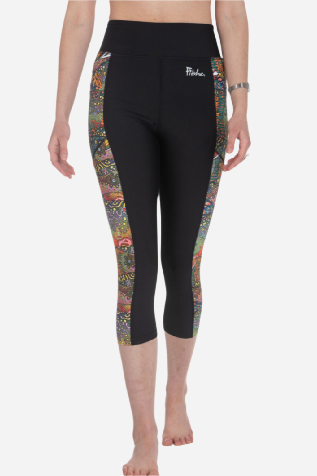 A high-rise waistband offers supportive, stay-put coverage, while the Brookie fish design adds a splash of artistic flair down each side panel. With deep pockets and a capri cut ideal for warm-weather activities, they're your new favorite go-anywhere, do-anything tights.