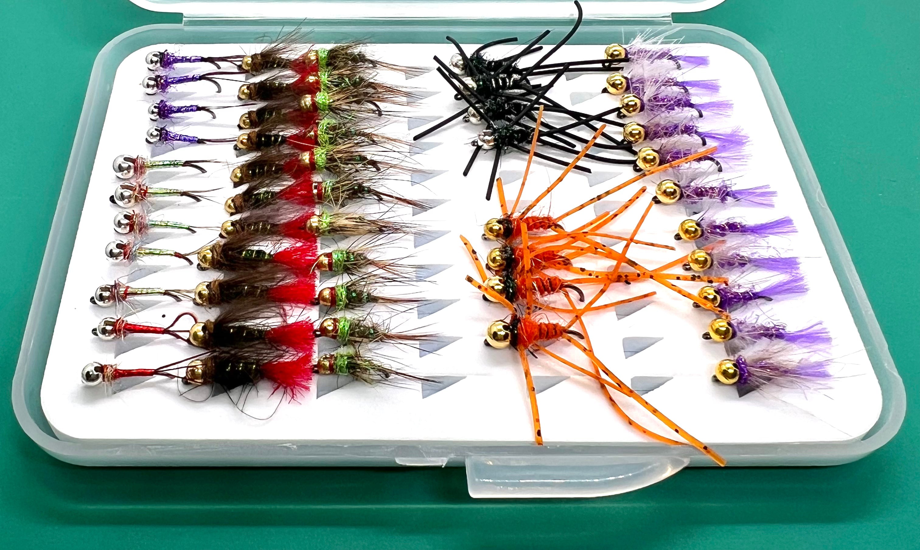 Complete box of Euro Nymphs. A variety of patterns and sizes to.fit any condition.