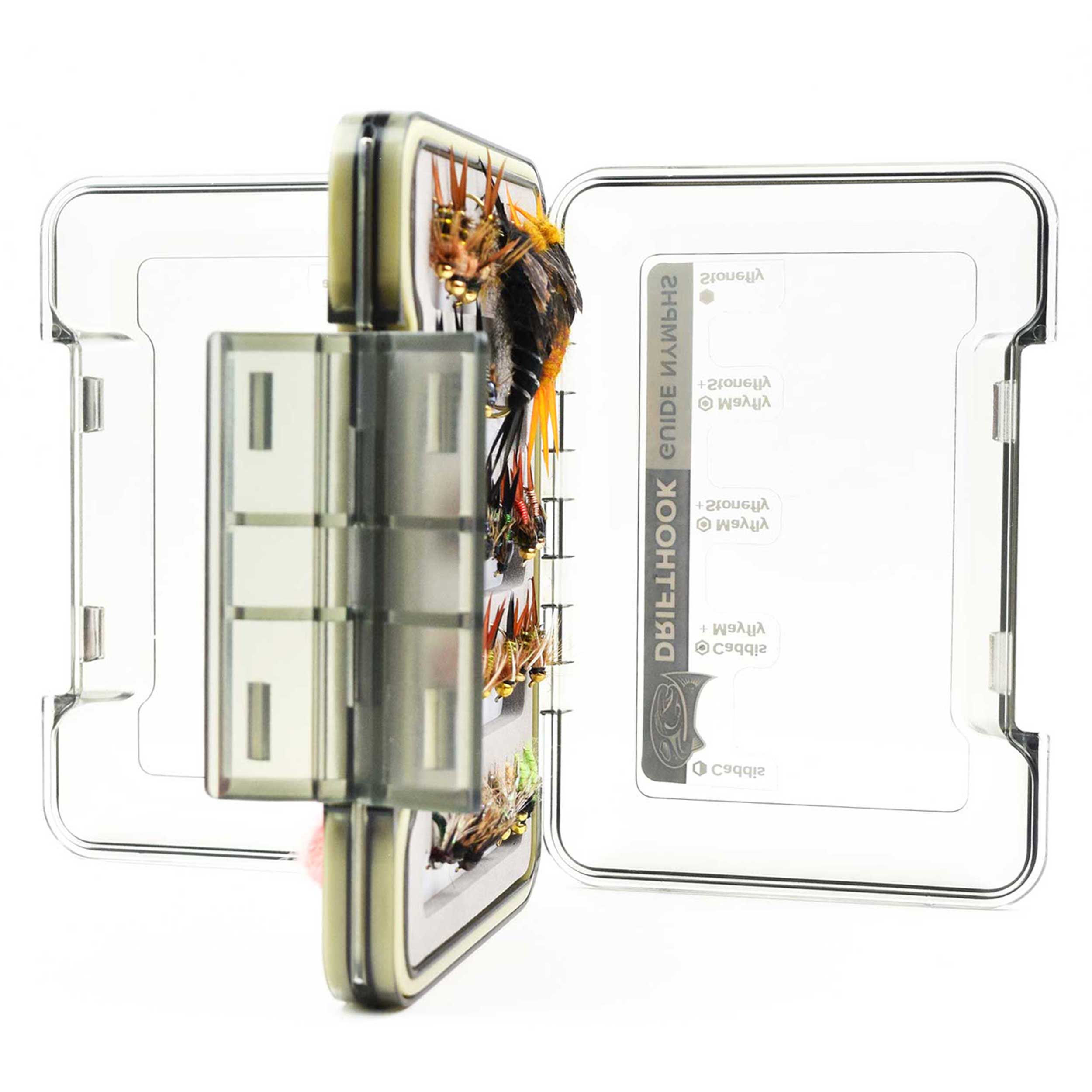 • Double-sided water-resistant fly box labeled by pattern helps keep your flies organized