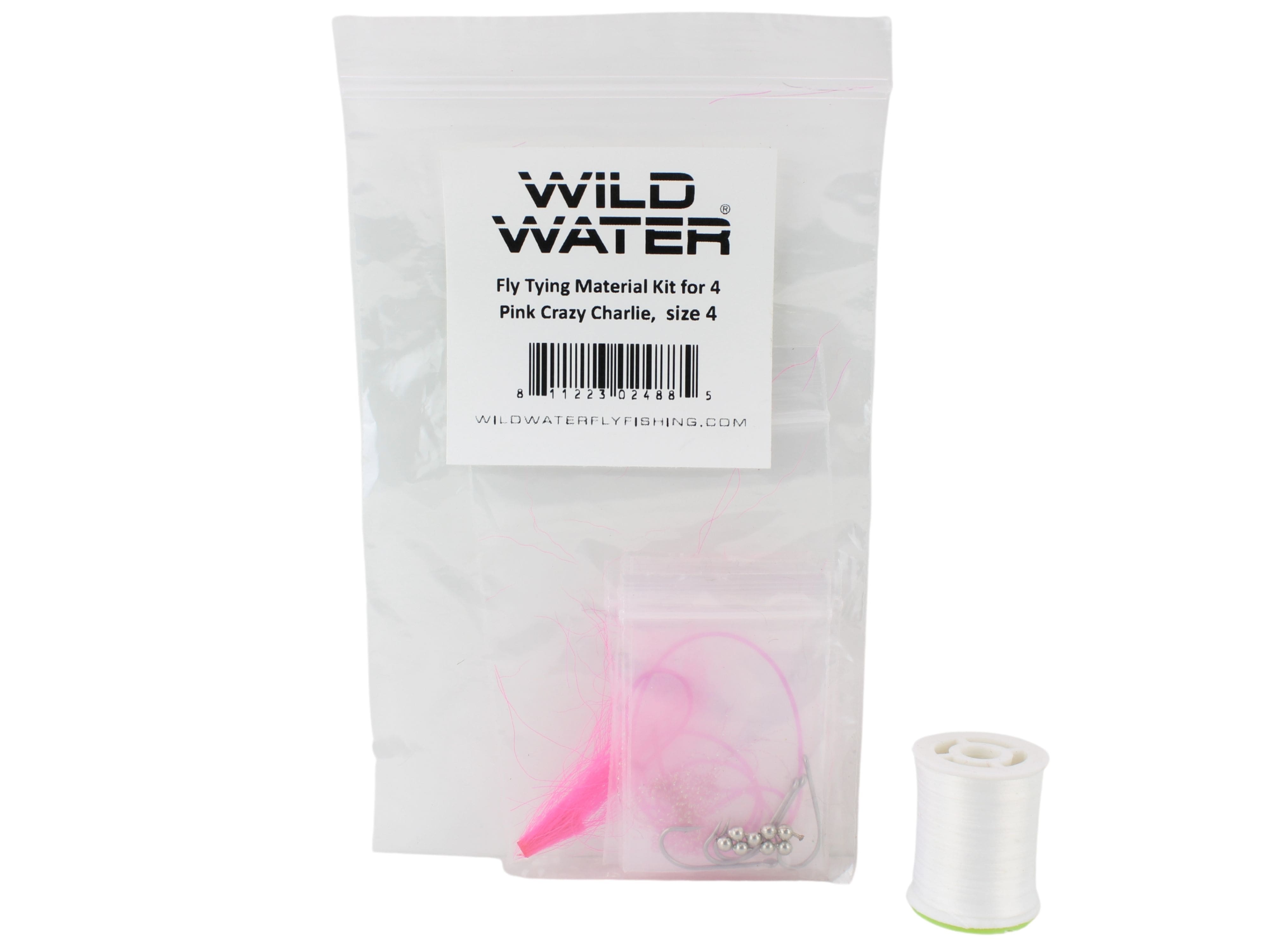 Wild Water's fly tying kits give you all the materials you need to tie a small batch of flies.  This kit gives you enough materials and hooks to tie 4 Pink Crazy Charlie, hook size, 4.  You will also get a spool of thread and a sample tied fly with this kit.