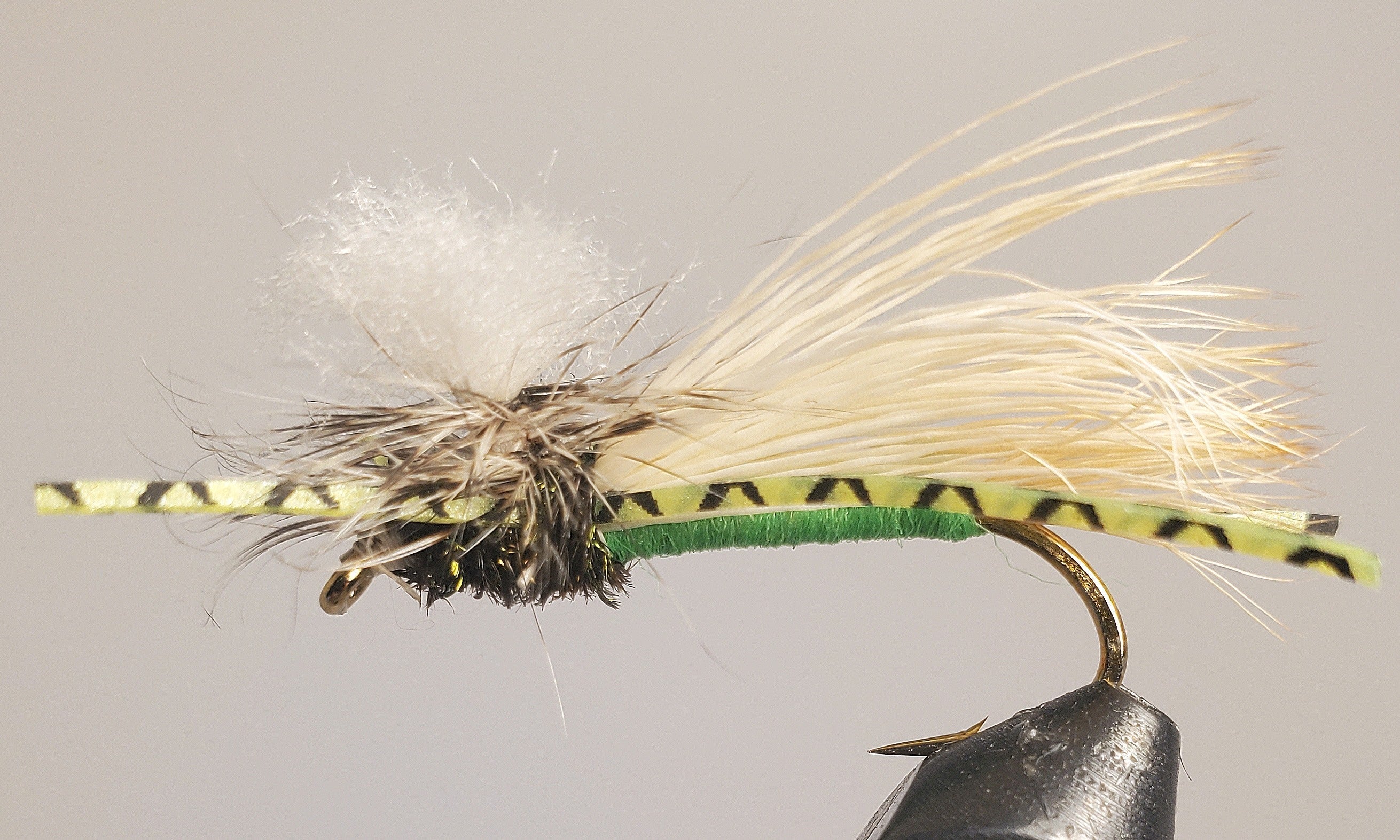 The Silly Leg Hopper is a version of the PMX / X-Hopper with barred rubber legs.  These rubber legs have stripes that imitate the natural striation on a grasshopper-s legs but the rubber gives them action inducing more strikes!