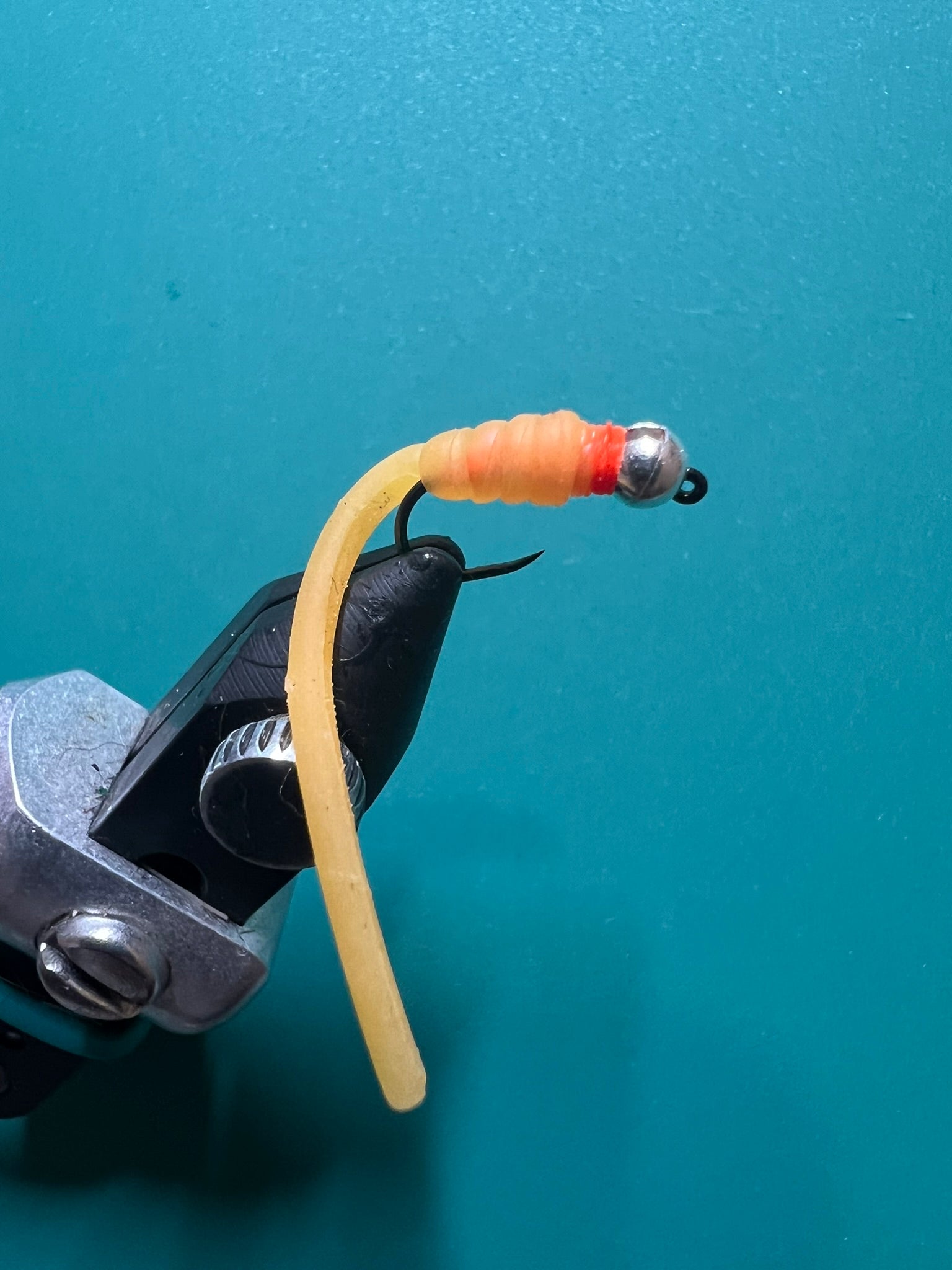 A variation of the Squirminator tied with jig hooks and tungsten beads.