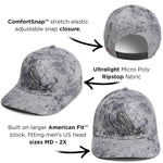 MAYFLY fly fishing cap is on our Riverside 6-Panel cap featuring a structured front and snapback. Coupled with our American Fit sizing which fits US head sizes MD - XX. A better fit on a larger range of big head sizes. Additionally, this fly fishing cap features our Comfort Snap snapback which combines the stretch of elastic with the adjustability of a snapback for even more comfort and stretch. Lastly, the mayfly cap is available in 4 of our Cirrus patterns: Black, Grey, Blue, and Olive.