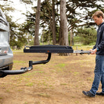 • PORTABLE HITCH TABLE: This travel friendly hitch mounted table measures 38 x 24”. The arm that holds the ledge will fit into a 2” square receiver and swivels away from your vehicle and locks in place.