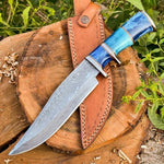 14-Inch Raindrops Damascus Steel Hunting Bowie Knife | Custom Handcrafted with Colored Bone Handle & Leather Sheath | KBS Knives
