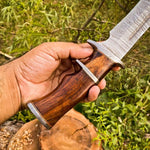 The handle is crafted from premium rosewood, providing a comfortable and secure grip, while the Damascus steel double finger guard offers added protection. Accompanied by a high-quality leather sheath, this custom Bowie knife is perfect for carrying on your next hunting adventure.