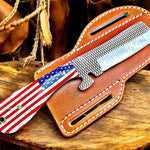 On the open plains where every cut matters, the Calf Cutting Knife is a trusted companion for ranchers and hunters alike. Its 4.1-inch rasp steel blade is razor-sharp and built for precision, making it ideal for the most demanding tasks. The epoxy resin handle, featuring American flag scales, is not just a grip but a tribute to craftsmanship and country pride. Encased in a western-style leather sheath, this knife is made to endure. A blade for those who carry tradition in their hands, we call it Lone Star Edge—a symbol of resilience and skill.