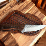 Channel the rugged spirit of the frontier with this cowboy belt knife, expertly handcrafted for durability and style. With an 8-inch overall length and a 4-inch full tang blade forged from high-quality rasp tool steel, this knife is designed for exceptional strength and reliability. The rosewood handle provides a comfortable grip and classic look, perfect for any outdoor enthusiast. Complete with a premium leather sheath, this knife offers both protection and easy access. Whether on the ranch, campsite, or trail, it’s the perfect tool for the cowboy at heart.