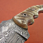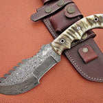 Experience precision and durability with the Custom Handcrafted Damascus Steel Tom Brown Tracker Knife. This expertly crafted Tracker Knife features a 9.5-inch Damascus Steel blade renowned for its exceptional sharpness and resilience. The handle is made from premium mountain sheep horn, offering a distinctive and comfortable grip. With a Rockwell Hardness of 55-58 HRC, this knife ensures top-notch edge retention and strength. It comes with a horizontal leather sheath for secure and practical carrying. Perfect for survival, camping, and tactical applications, this Tracker Knife from KBS Knives combines functionality with elegance, making it a must-have for outdoor enthusiasts and combat professionals.