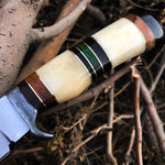 The handle combines Bone and Colored Wood materials, offering both a sturdy grip and a visually appealing design. The Damascus Guard not only enhances the knife's aesthetics but also provides excellent hand protection, ensuring safe use in the field. With a Rockwell Hardness of 55-58 HRC, this blade is built to withstand the toughest tasks while maintaining its sharpness.