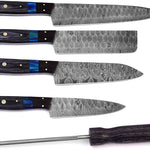 Transform your culinary experience with our premium damascus kitchen knife set. This custom handmade collection includes essential knives: a Chef Knife, Santoku Knife, Cleaver Knife, Paring Knife, and a knife sharpener. Ranging from 8 to 13 inches in overall length, each knife features a full tang forged Damascus steel blade, delivering exceptional sharpness and durability. The striking handles, crafted from black and blue exotic pakka wood, provide a comfortable grip and enhance the aesthetic appeal of your kitchen. Choose between a sleek leather roll or a sturdy block for stylish and practical storage solutions.