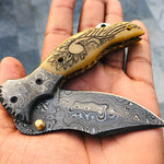 Custom Handmade Damascus Steel Engraved Folding Pocket Knife with Leather Case - KBS Knives Store