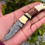 Custom Handmade Damascus Steel Small Folding Pocket Knife with Bone, Rosewood, and Brass Bolsters Handle