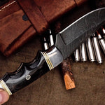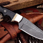 Unleash your hunting prowess with our premium Deer Hunting Knife, designed for both functionality and aesthetic appeal. This custom handmade knife boasts a 4.25-inch full tang blade crafted from high-quality Damascus steel, renowned for its durability and exceptional edge retention. With an overall length of 8.5 inches, it is perfectly sized for handling and precision during your hunting adventures. The handle, made from buffalo horn and accented with steel bolsters, provides a comfortable and secure grip, making it an ideal companion for field dressing and other outdoor tasks. Each knife comes with a durable leather sheath, ensuring safe storage and easy transport.
