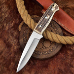 Experience the precision and craftsmanship of our fixed blade skinning knife, meticulously designed for outdoor enthusiasts and hunters. This custom handmade knife features an overall length of 7.75 inches and a blade length of 3.75 inches, expertly crafted from full tang D2 steel, ensuring exceptional durability and sharpness. The handle, made from genuine antler horn, offers a comfortable grip and a unique aesthetic that stands out in any collection. This knife comes with a high-quality leather sheath for safe storage and easy transport, making it the perfect companion for your next hunting adventure.