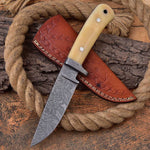 Custom Handmade Full Tang Hunting Knife with Fire Pattern Damascus Steel Blade, Bone Handle, and Leather Sheath - 8.75 Inches