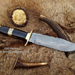 Elevate your hunting gear with the Custom Handmade Hunting Bowie Knife, expertly crafted to meet the demands of outdoor enthusiasts. This 13-inch knife features a Custom Handcrafted Damascus Steel Blade renowned for its exceptional sharpness and unique pattern. The handle is made from durable Buffalo Horn, providing a comfortable grip, and is accentuated with Brass Spacers, a Brass Guard, and a Brass Clip for added strength and elegance. With a Rockwell Hardness of 55-58 HRC, this knife is engineered to maintain a sharp edge and withstand rigorous use. The knife is accompanied by a high-quality leather sheath for secure carrying and protection. Perfect for hunters and survivalists, this Bowie Knife from KBS Knives combines practicality with artistry.