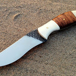 Experience the perfect blend of craftsmanship and functionality with our Hunting Knife, designed for serious outdoor enthusiasts. This custom handmade knife features a 4.25-inch blade crafted from full tang stone texture hand-forged 1095 high carbon steel, ensuring durability and excellent edge retention. With an overall length of 8.5 inches, this knife is well-balanced for a variety of tasks in the field. The handle, made from a combination of bone and rosewood, not only offers a comfortable grip but also showcases a stunning aesthetic that sets this knife apart. Each knife comes with a durable leather sheath, making it easy to carry and store securely.