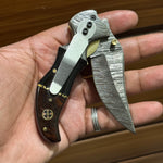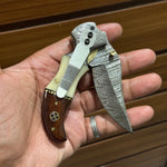 Damascus Handmade Custom Folding Pocket Knife with Buffalo Horn and Rosewood Handle, 3.2-inch Blade Length
