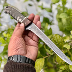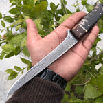 The Damascus Steel handmade Fillet-Boning Knife by KBS Knives Store is a premium quality knife, designed for precise cutting and filleting of fish and meat. The blade is made of high-quality Damascus steel, known for its toughness and sharpness. The knife features a beautiful handle made of Rosewood, Buffalo horn, and brass spacer, providing an elegant look and comfortable grip.
