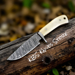 The handle combines natural bone with a Damascus guard, offering a solid grip and a striking, handcrafted appearance. Each knife is built to withstand the rigors of hunting, skinning, and outdoor use.