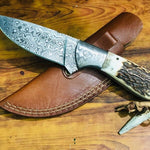 Deer Skinning Knife Custom Handmade Raindrops Damascus Steel with Antler Horn Handle, 8.5-inch - The Wildcrest