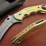 Introducing the Tiger Claw, an exquisite folding pocket knife designed for everyday carry. This custom handcrafted knife features a hand-engraved Damascus steel blade with a 3.1-inch cutting edge, known for its razor-sharp performance and durability. The unique handle is crafted from hand-engraved brass with a convenient finger hole, providing both style and superior grip. The liner lock mechanism ensures secure blade operation, while intricate file work on the liner and spine enhances the knife's aesthetic and functional appeal. Complete with a high-quality leather sheath, the Tiger Claw combines artistry and practicality, with a Rockwell Hardness of 55-58 HRC for enduring sharpness. Available exclusively at KBS Knives Store.