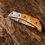 Hand Engraved Custom Damascus Steel EDC Folding Pocket Knife | 3-Inch Blade, Olive Wood Handle, Leather Case | Gift Idea