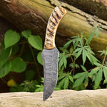 Introducing our exceptional Damascus Hunting Knife, meticulously crafted to meet the highest standards of quality and performance. With its impressive overall length of 8.5 inches, this knife is designed to tackle any hunting or outdoor task with ease. The standout feature of this knife is its exquisite sheep horn handle, which not only provides a comfortable grip but also adds a touch of elegance to its overall appearance.