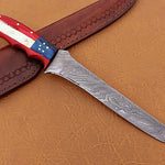 Enhance your culinary experience with this exquisite handmade Damascus Steel Fillet-Boning Knife featuring a Texas Flag Red-Blue Exotic wood and Bone handle. With an overall length of 13 inches, this knife offers precision cutting and filleting capabilities. The unique combination of Damascus steel, Texas Flag Red-Blue Exotic wood, and Bone handle makes it a statement piece in any kitchen. Complete with a leather sheath, this handcrafted knife by KBS Knives Store is a perfect blend of functionality and artistry.