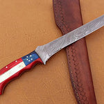 Handmade Damascus Steel Fillet-Boning Knife with Texas Flag Red-Blue Exotic Wood and Bone Handle - 13 Inch Overall Length