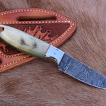 Forged from layered Damascus steel, the blade is razor-sharp and made to hold an edge through rough use. The mountain sheep horn handle offers a natural, ergonomic grip, while the steel bolster adds strength, balance, and a clean Western look.