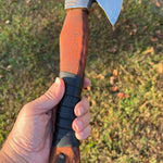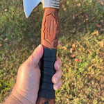 Introducing a meticulously crafted Native American tomahawk axe featuring a custom handmade forged 1095 steel blade. This tomahawk showcases a small but powerful blade designed for precision and durability. The handle is constructed from rosewood, wrapped in leather for added grip and comfort. With a Rockwell Hardness of 55-60 HRC, "The Sentinel" offers a sharp, resilient edge that’s ideal for everyday use. It comes with a leather sheath for secure storage and easy transport. This versatile tool combines historical craftsmanship with modern functionality, making it a valuable addition to any collection or gear.
