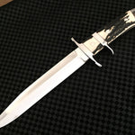 Elevate your hunting experience with the Pig Sticker Knife, a robust and reliable tool designed for the serious hunter. This custom handmade Bowie knife features a full tang D2 steel blade, known for its superior edge retention and durability. With an overall length of 13 inches, the Pig Sticker Knife is perfectly balanced, making it an essential companion for hunting large game.