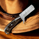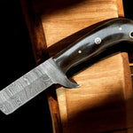 Experience the legendary beauty and performance of this exceptional Damascus bull cutter, featuring a stunning 3.5-inch Damascus steel blade with distinctive wave patterns. Paired with an authentic African water buffalo horn handle, this knife represents the perfect marriage of ancient craftsmanship and Western heritage.