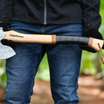 Embrace the legendary strength of the Norse with the Viking Axe. Crafted with a custom handmade forged Damascus steel blade, this axe offers superior sharpness and durability. The ash wood handle, wrapped in leather, provides an authentic and secure grip for optimal control and comfort. With a Rockwell Hardness of 55-60 HRC, the blade is designed to maintain its edge even under rigorous use. Complete with a premium leather sheath, the "Ragnar's Fury" is perfect for both practical tasks and historical reenactments. Equip yourself with a tool that combines ancient tradition with modern craftsmanship.