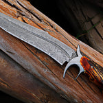 The handle, crafted from genuine Antler Horn, offers a comfortable and secure grip, adding a touch of rugged elegance to this powerful blade. The Damascus finger guard enhances the knife’s aesthetic while providing essential protection during use. The Rockwell Hardness of 55-58 HRC ensures that this blade maintains its edge even under the most demanding conditions.
