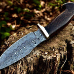 The forest was still, the only sound the rhythmic crunch of boots against damp earth. A seasoned hunter moved silently, his eyes locked on the trail ahead. In his grip rested Stormborn, a custom hunting knife crafted for moments like this. Its 5-inch Damascus steel blade, honed to perfection, gleamed under the moonlight. The rosewood handle, smooth yet rugged, fit effortlessly in his palm, while the steel guard ensured balance and control.